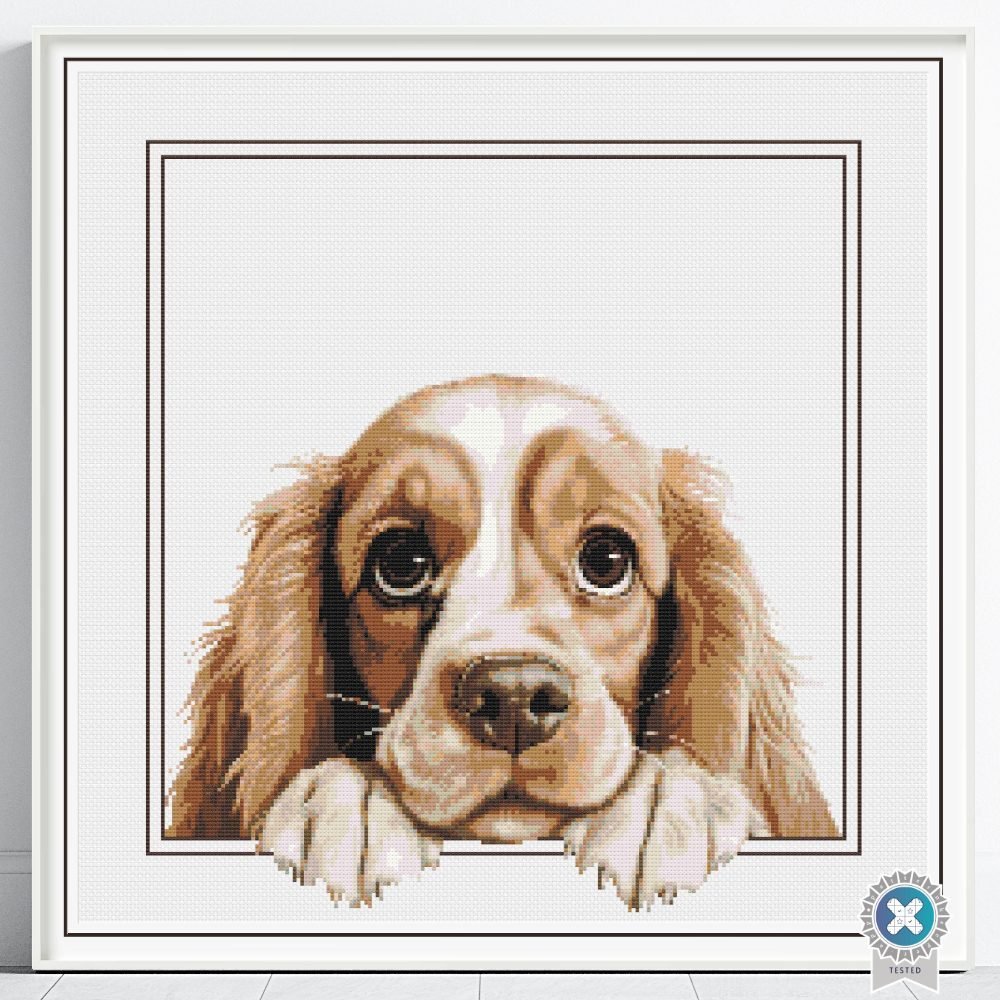This delightful design captures the playful and lovable personality of an American Cocker Spaniel peeking over its paws. Perfect for dog lovers and cross-stitch enthusiasts, this pattern makes a wonderful addition to your craft projects, whether as a gift or for your own decor.