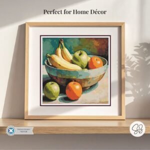 Create a timeless still life with this full-coverage cross stitch pattern of apples, oranges, and bananas arranged in a rustic ceramic bowl. Inspired by watercolor artwork, this design stitches into a warm and painterly piece perfect for kitchen or dining room décor.