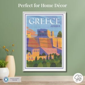 Capture the timeless beauty of Athens, Greece, with this modern full coverage cross stitch pattern inspired by vintage travel posters showcasing the majestic Parthenon.