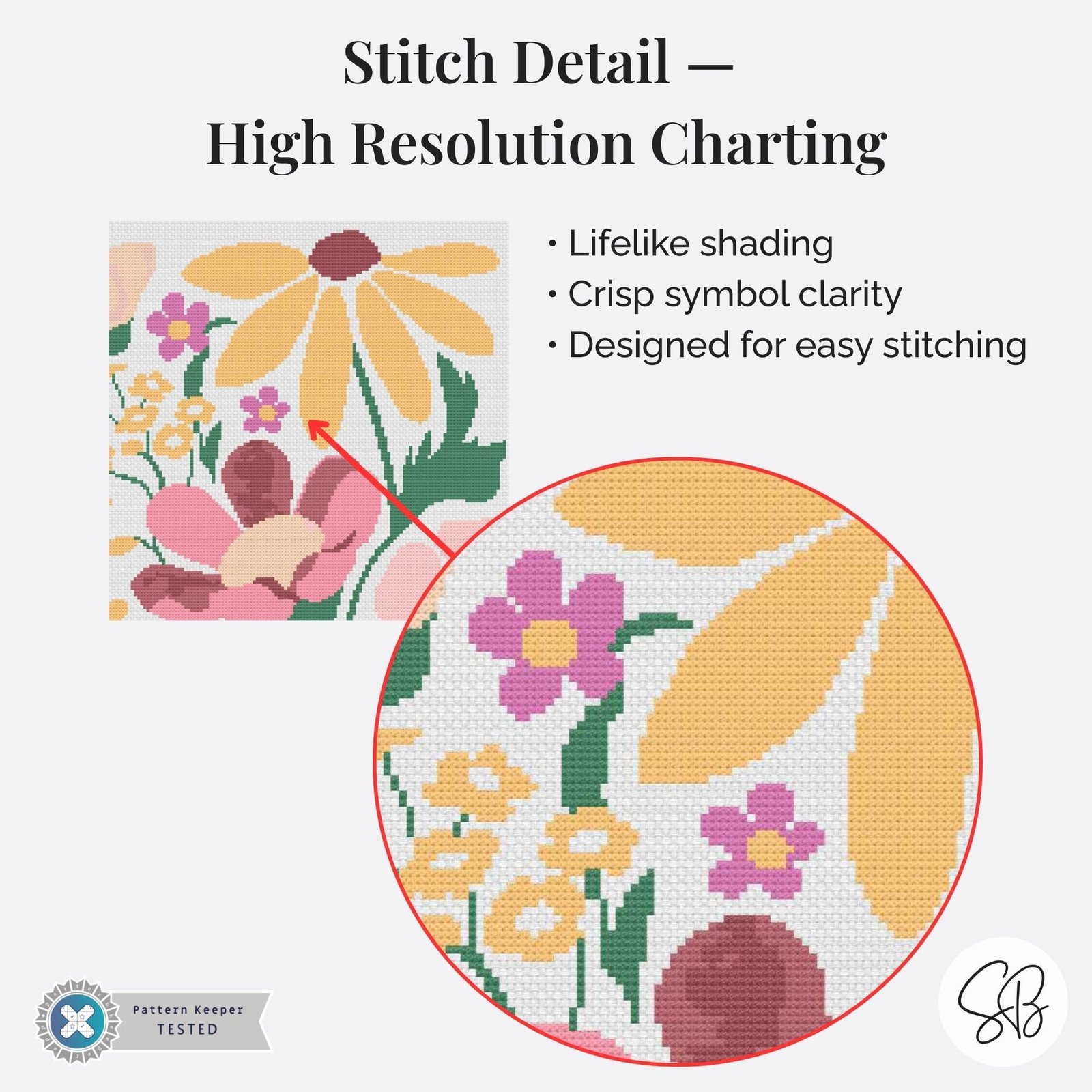 Designed as a partial coverage pattern, the background fabric remains visible, allowing the flowers to shine while keeping the project enjoyable and approachable. It’s a perfect stash-friendly piece that works beautifully on a variety of neutral or pastel fabrics.
