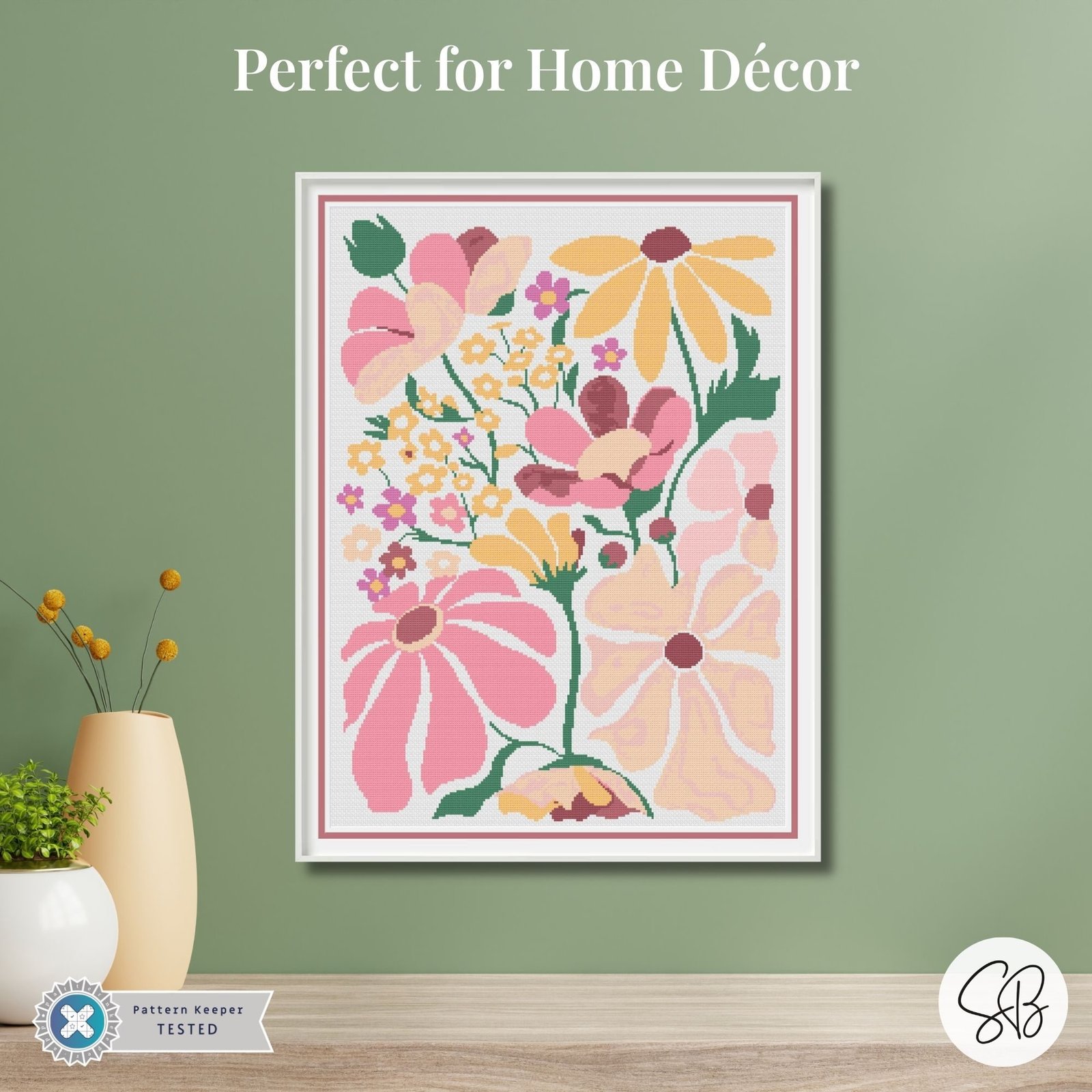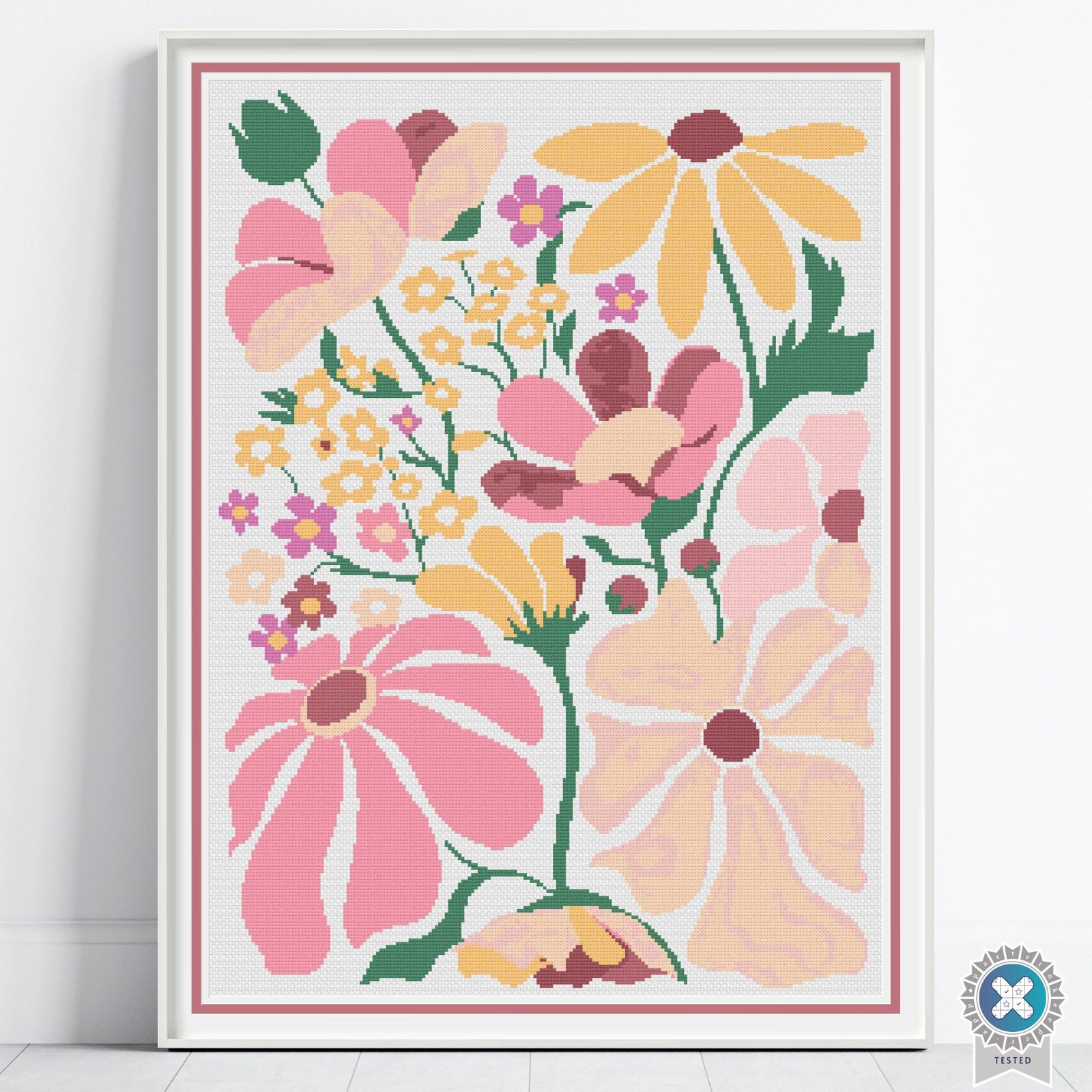 Bring soft color and modern charm to your stitching with this Modern Boho Flowers cross stitch pattern. Featuring stylized florals in warm pinks, peaches, buttery yellows