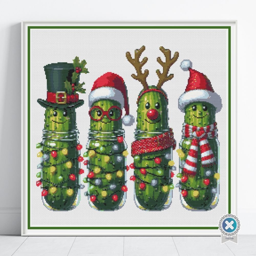 Add a dash of festive fun to your stitching with this adorable Christmas Pickles Cross Stitch Pattern 🥒🎄. The design features four cartoon pickles standing upright in narrow jars, each wearing a different Christmas hat, with twinkling string lights wrapped around them.
