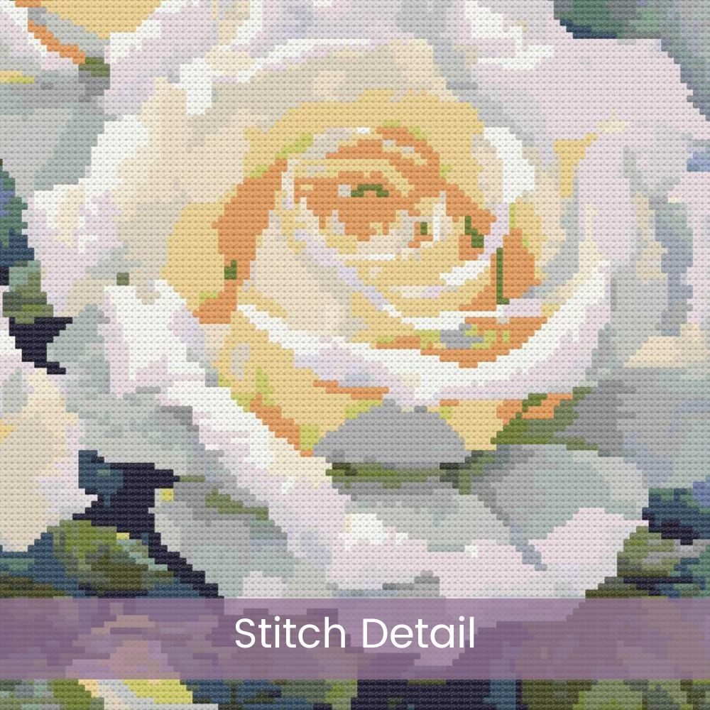 Bring timeless elegance into your stitching with this stunning full coverage cross-stitch pattern of a bouquet of white roses.